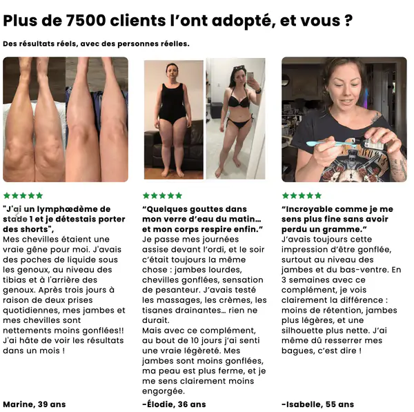 Sa formule cible le réseau lymphatique—le système chargé d’évacuer l’excès d’eau et les déchets métaboliques—et favorise la microcirculation. Résultat : le corps draine mieux, l’inconfort dû à la rétention d’eau diminue, et l’apparence du ventre paraît plus plate tandis que les jambes se sentent plus légères. Le tout, avec une action progressive et respectueuse de l’équilibre naturel.