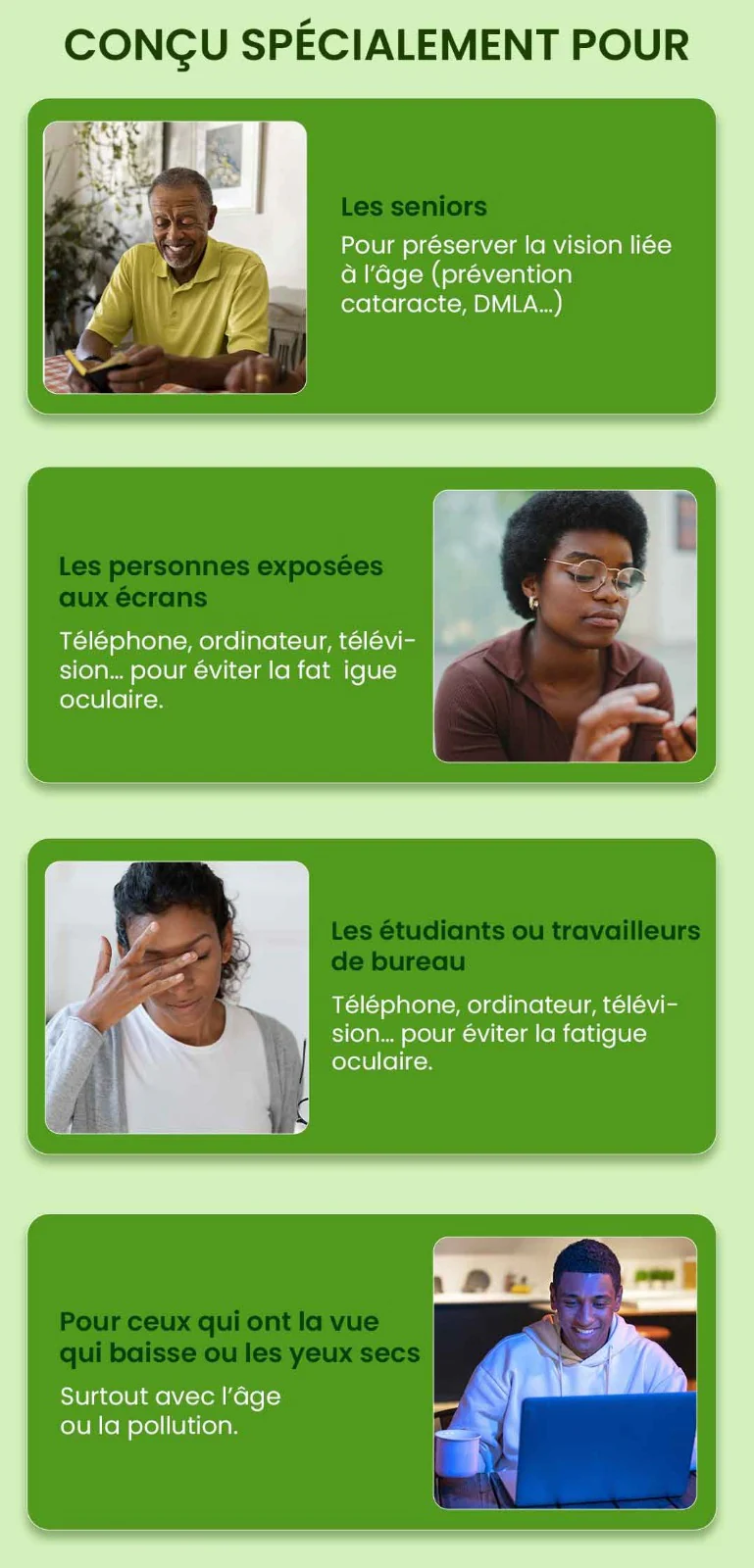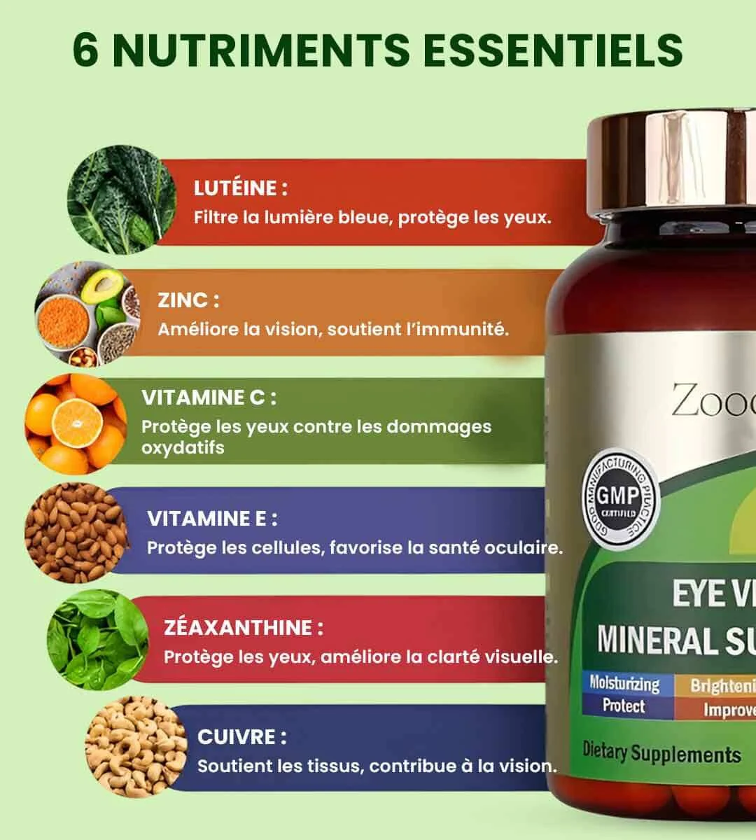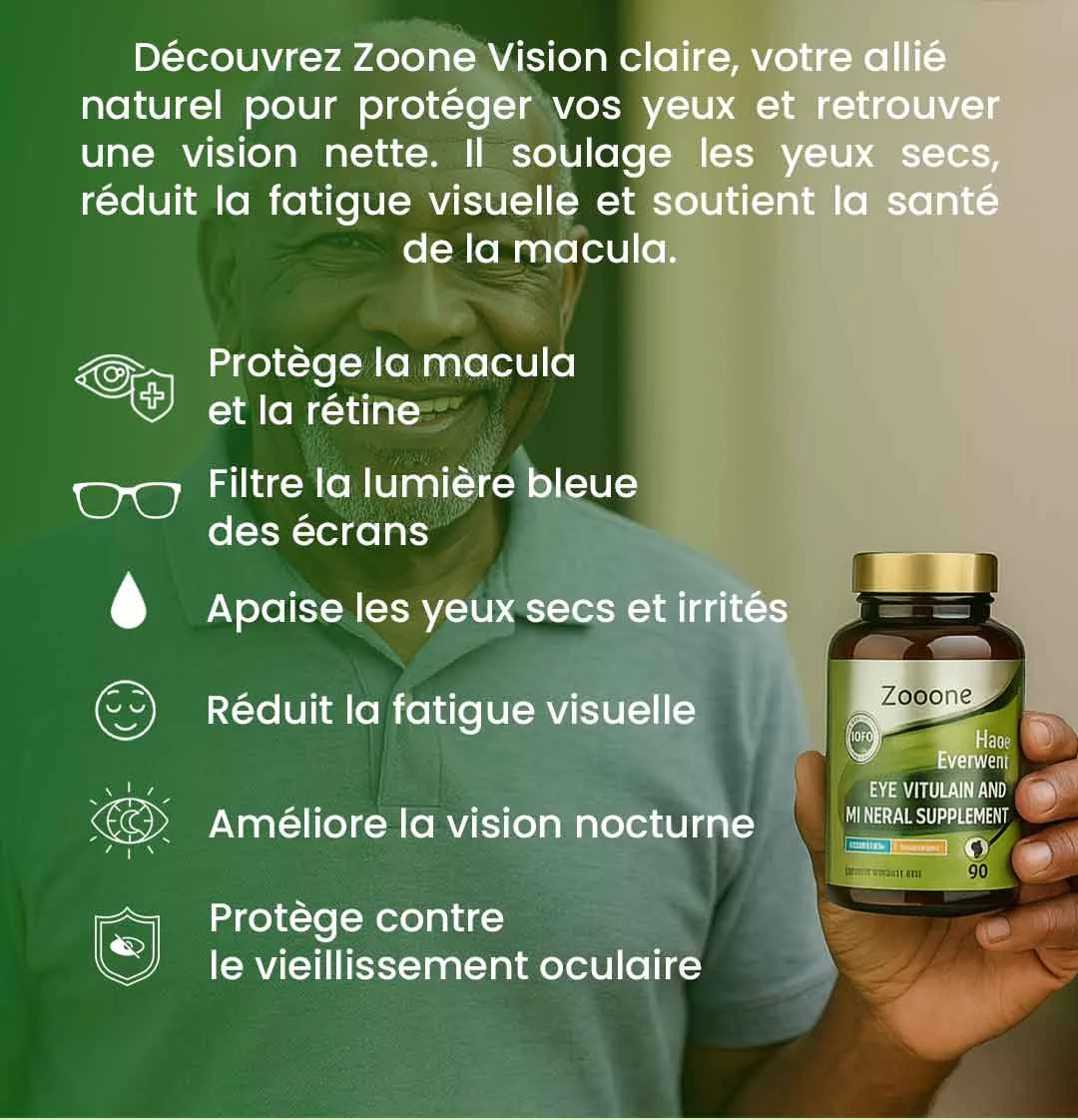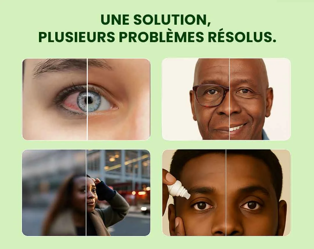 Notre supplément est conçu pour répondre à plusieurs problèmes de santé oculaire. Il protège vos yeux, soulage la fatigue et contribue à maintenir une vision claire, offrant un soutien global à votre santé visuelle.