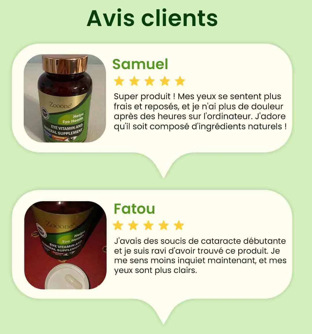 Grâce à ses effets visibles et son confort oculaire durable, notre supplément a conquis des centaines de clients. Offrez à vos yeux la protection et le bien-être qu’ils méritent, et rejoignez ceux qui profitent déjà d’une vision saine et apaisée.