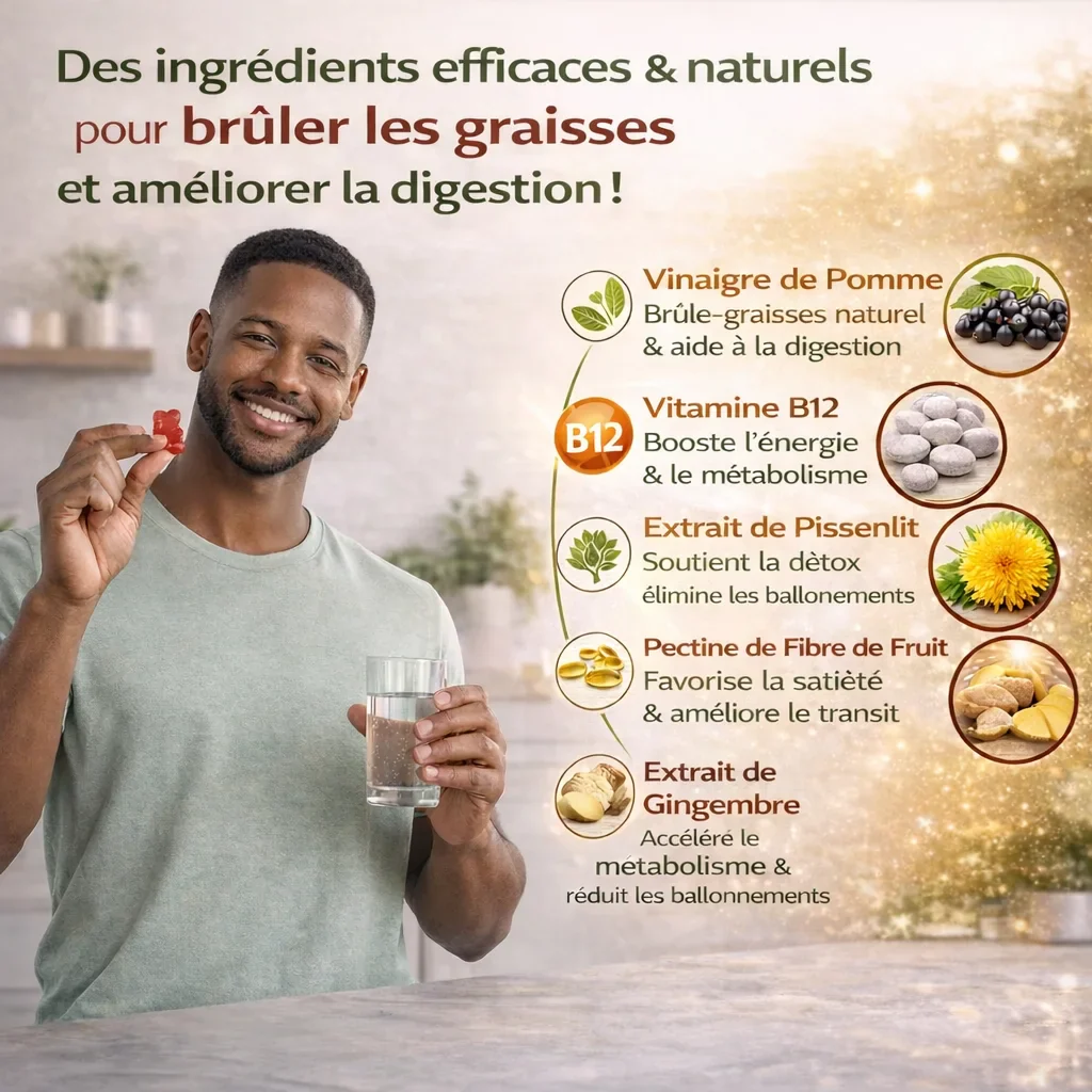 Les excès alimentaires, le stress et un métabolisme lent font stocker la graisse. Ces gummies au vinaigre de cidre ciblent naturellement ces zones rebelles pour que votre corps retrouve sa légèreté.